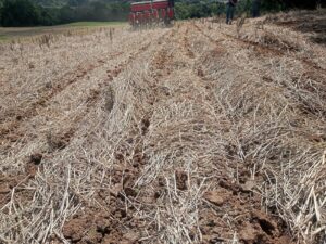 Após 90 dias do plantio do mix de adubação verde, já com os grãos de aveia preta e de centeio em metade do estágio de maturação – o grão leitoso, a cobertura foi acamada utilizando uma madeira de arrasto. Passados 15 dias desse processo de acamamento, ou seja, de deitar as plantas que estavam crescendo, foi realizado o plantio do milho crioulo variedade Macaco. Importante reforçar que tanto o milho Macaco, quanto às demais variedades, são todas livres de transgênico, promovendo maior autonomia das famílias, que poderão produzir a sua própria semente, além de colaborar com a segurança alimentar e nutricional das famílias, que terão a possibilidade de colher milho verde para consumo e os grãos para alimentação dos animais.